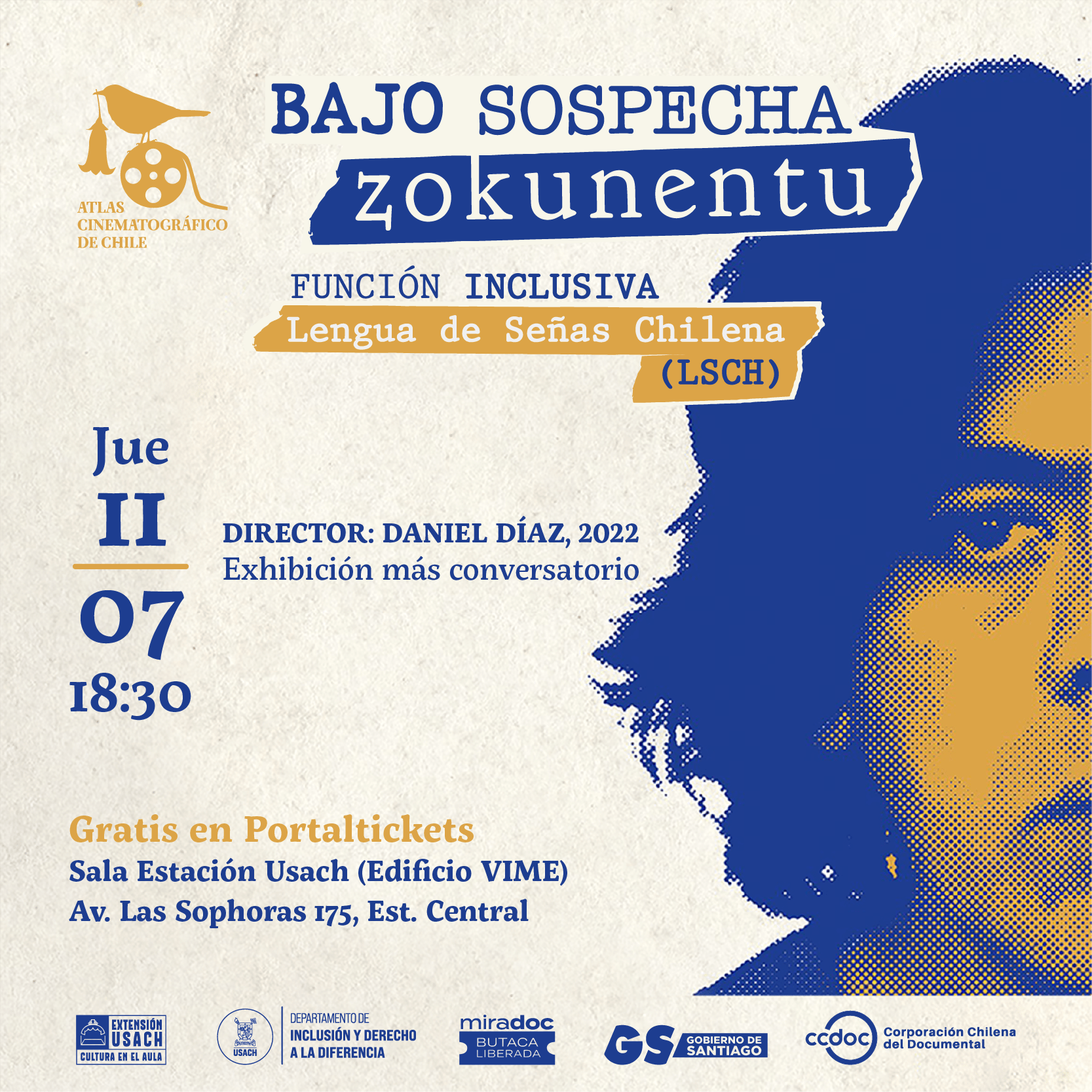 Función de la cuarta sesión 2024 del ciclo de Extensión Usach “Atlas Cinematográfico de Chile”, que en esta oportunidad presenta “Bajo sospecha: Zokunentu” (2022) dirigida por Daniel Díaz, distribuida por Miradoc y difundida en colaboración con el Departamento de Inclusión y Derecho a la Diferencia Usach. Una exhibición para la comunidad sorda y personas ciegas o con discapacidad visual donde se incorpora Lengua de Señas y herramientas de accesibilidad en todo su documental y en el conversatorio posterior. Encuentro que tendrá el público con su director y guionista Daniel Díaz acompañado del periodista Gonzalo Espinoza.