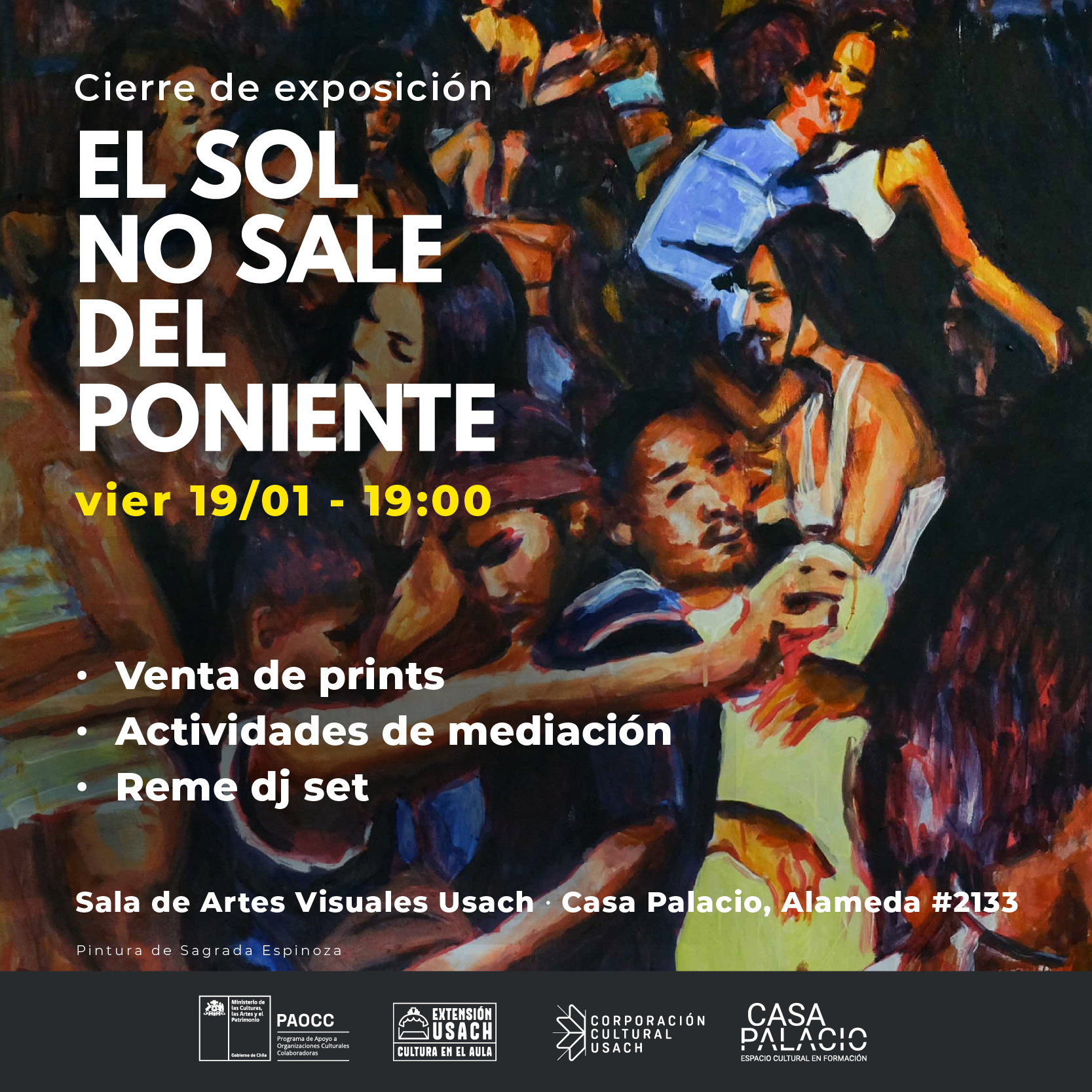 La Corporación Cultural y el Departamento de Extensión Usach le invitan al cierre de la exposición “El sol no sale del poniente. Nuevos márgenes de la pintura local”, el viernes 19 de enero a partir de las 19 horas en Sala de Artes Visuales Usach, ubicada al interior del Centro Cultural Casa Palacio, barrio Brasil.