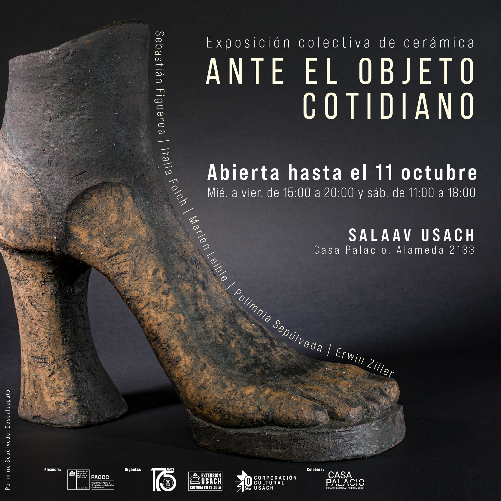 Los y las ceramistas nacionales Marién Leible, Polimnia Sepúlveda, Italia Folch, Sebastián Figueroa y Erwin Ziller llegan a SALAAV, ubicada al interior de Casa Palacio, con una serie de piezas inspiradas en objetos de uso diario. Durante su muestra se realizarán talleres, visitas guiadas y un remate de las obras.