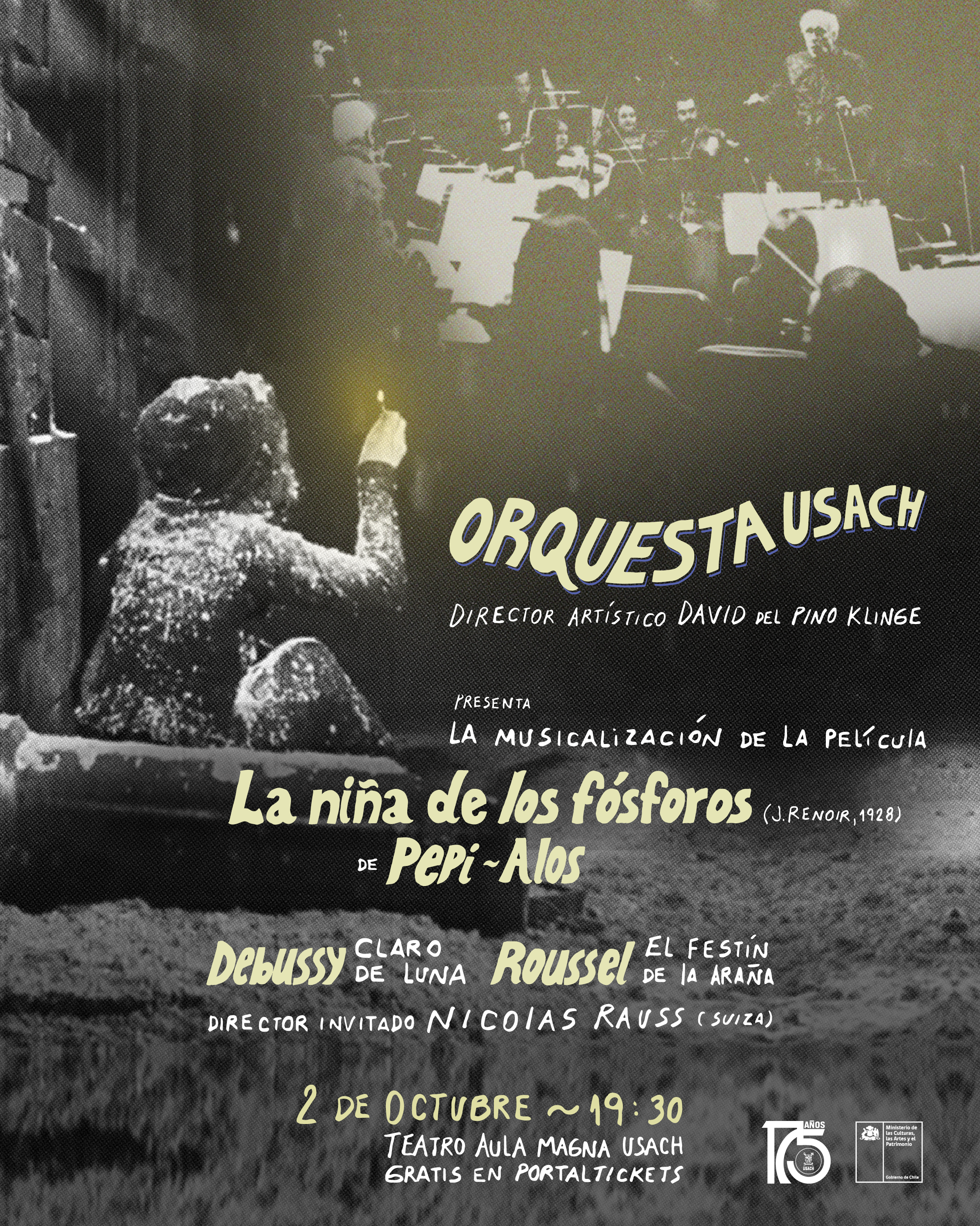 Bajo la dirección de Nicolas Rauss, la agrupación interpreta obras de Albert Roussel (1869-1937) y Claude Debussy (1862-1918). Luego, musicaliza en vivo la película muda La niña de los fósforos (1928), de Jean Renoir, con una obra encargada al compositor Jorge Pepi-Alos (1962), que tendrá su estreno absoluto en este concierto.