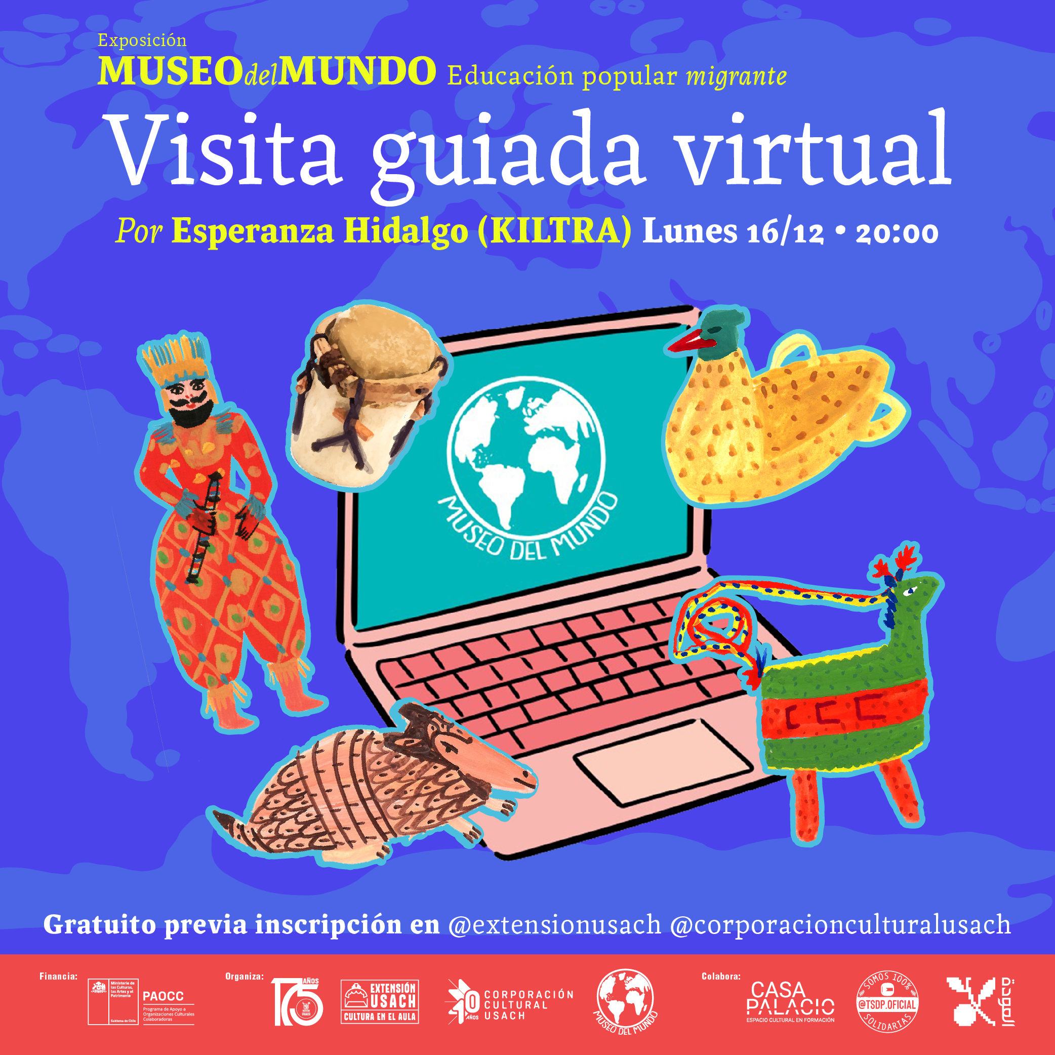 Extensión Usach, la Corporación de la Universidad de Santiago y el centro cultural en formación Casa Palacio, les invita a conectarse a una visita guiada online dirigida por la diseñadora de vestuario, productora audiovisual e investigadora Esperanza Hidalgo Faúndez (1990, Santiago de Chile), co-fundadora del proyecto Museo del Mundo, más conocida como KILTRA, encargada de diseñar vestuarios inspirados en las diversas culturas del mundo. A través de su experiencia entregará una breve historia de cómo se formó el museo junto a una guía virtual por cada rincón de nuestro sitio https://www.museodelmundo.org/ para conocer todos los recursos educativos que puedes usar y descargar libremente para aprender más sobre arte popular de todo el mundo. Nos vemos.